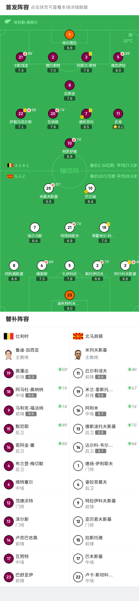 北京时间10月11日世界杯欧洲区预选赛 第一阶段小组赛 第7轮,比利时对阵北马其顿。最终比分比利时 0-0 北马其顿。